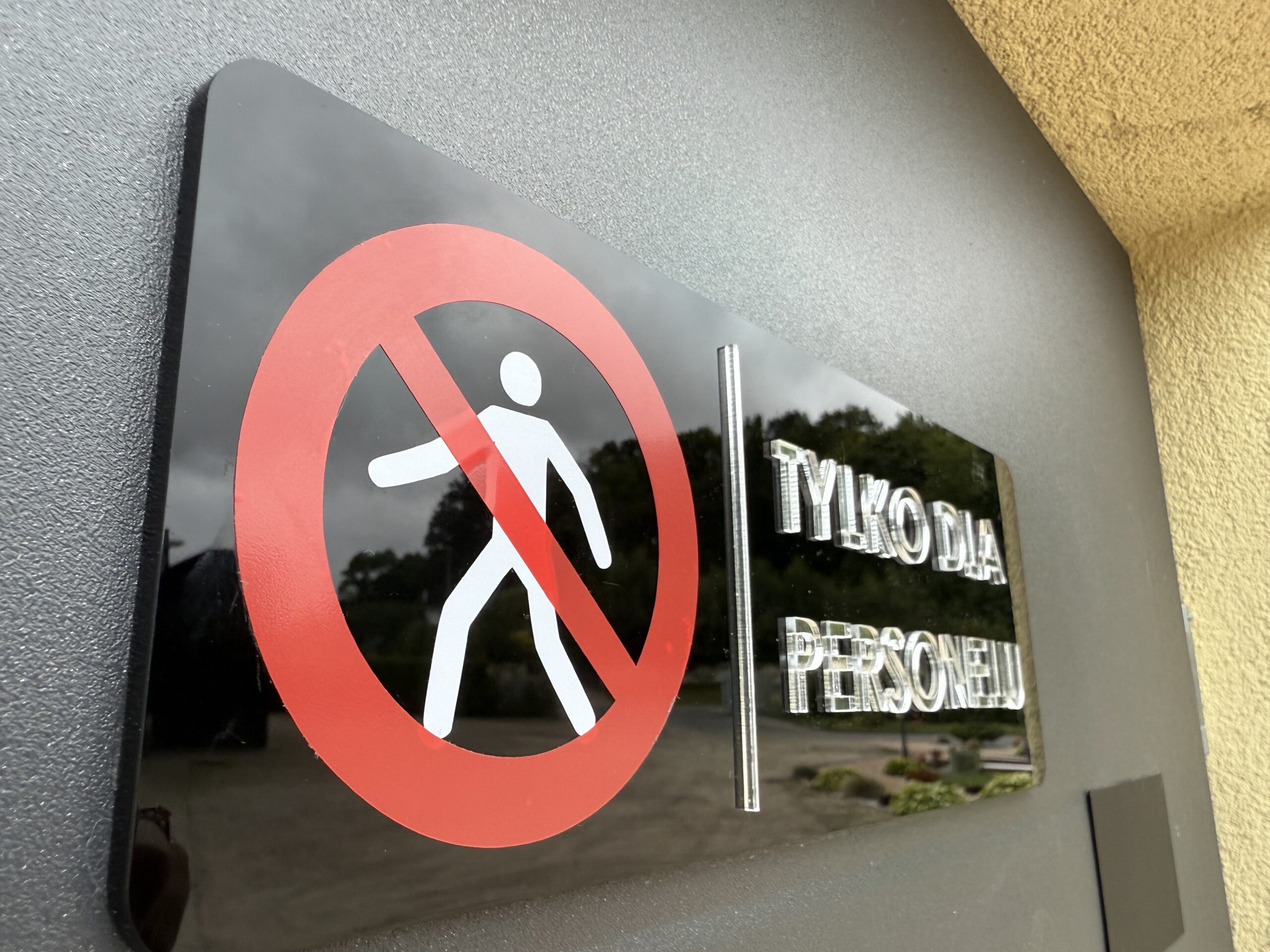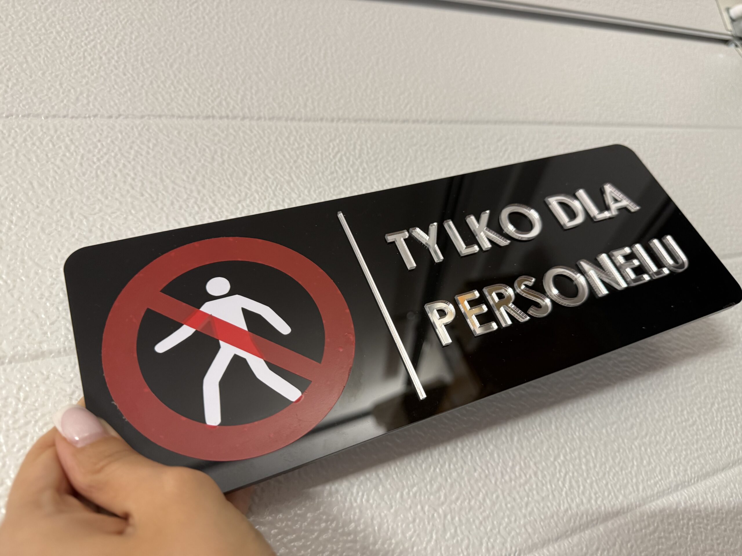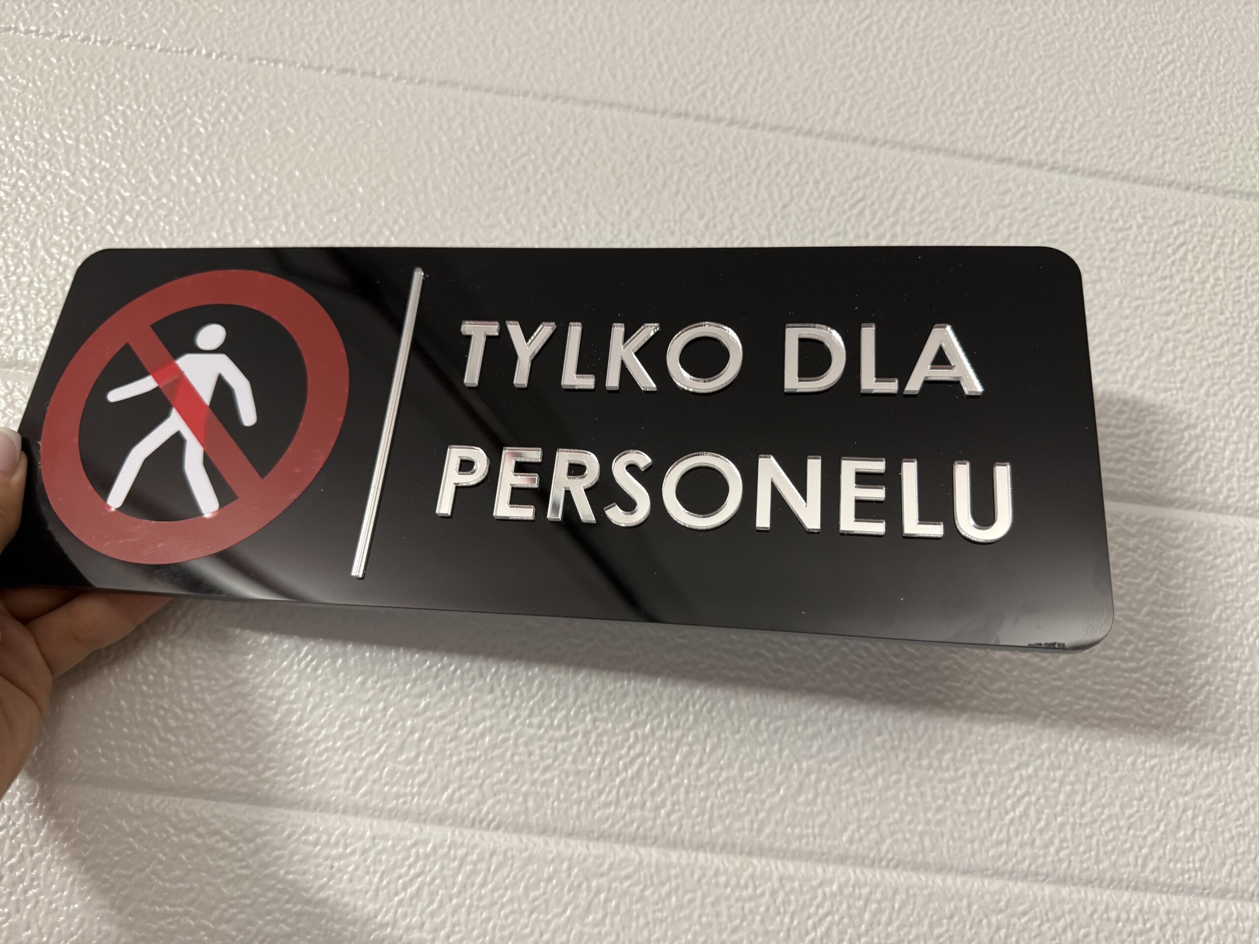 Profesjonalna tabliczka informacyjna wykonana z trwałego, czarnego akrylu z wyraźnym napisem „Tylko dla personelu” i piktogramem zakazu wejścia. Dzięki eleganckiemu wykończeniu i czytelnej grafice znak idealnie sprawdzi się w biurach, gabinetach, salonach kosmetycznych, restauracjach czy magazynach.